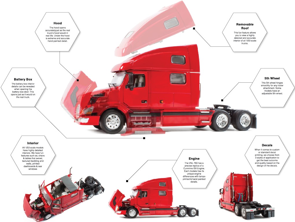 The VNL 780 has a precise replica of a Cummins ISX Engine. Each models has its unique engine differences with tampo printed & hand painted details.